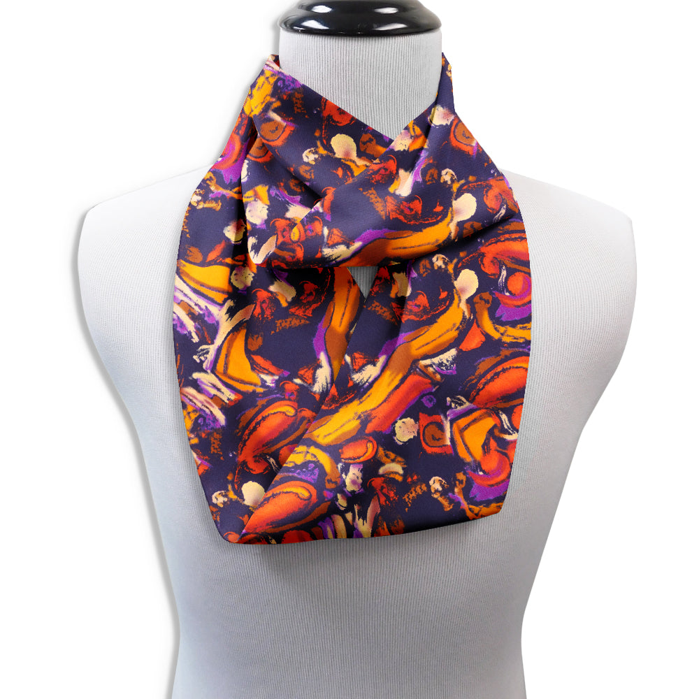 This beautiful abstract design in shades of orange and purple on a deep navy silk twill is sure to spice up your fall wardrobe.