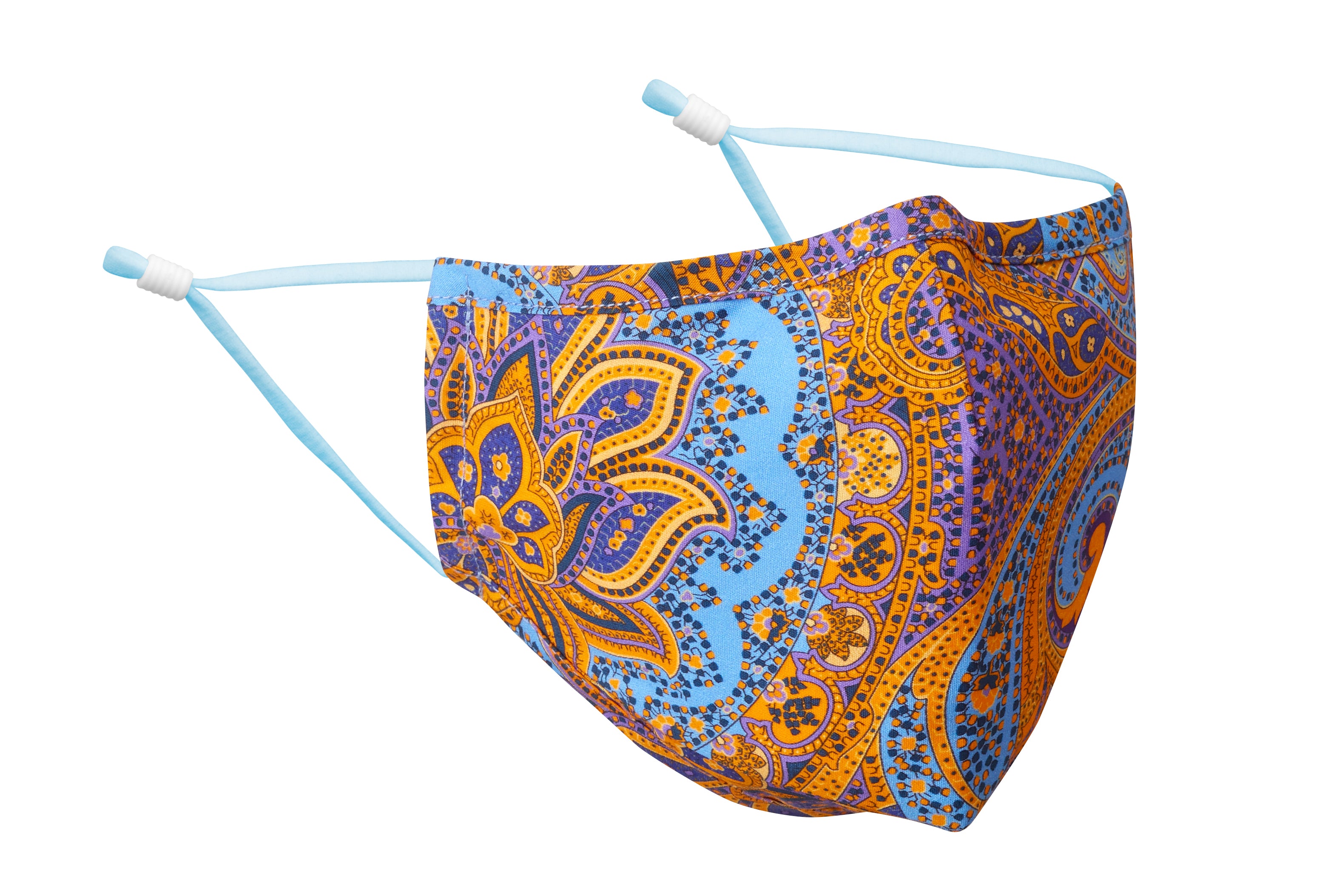 Graceful swirls of big gold and blue paisleys with light blue and purple backgrounds make this a totally charming face mask choice.