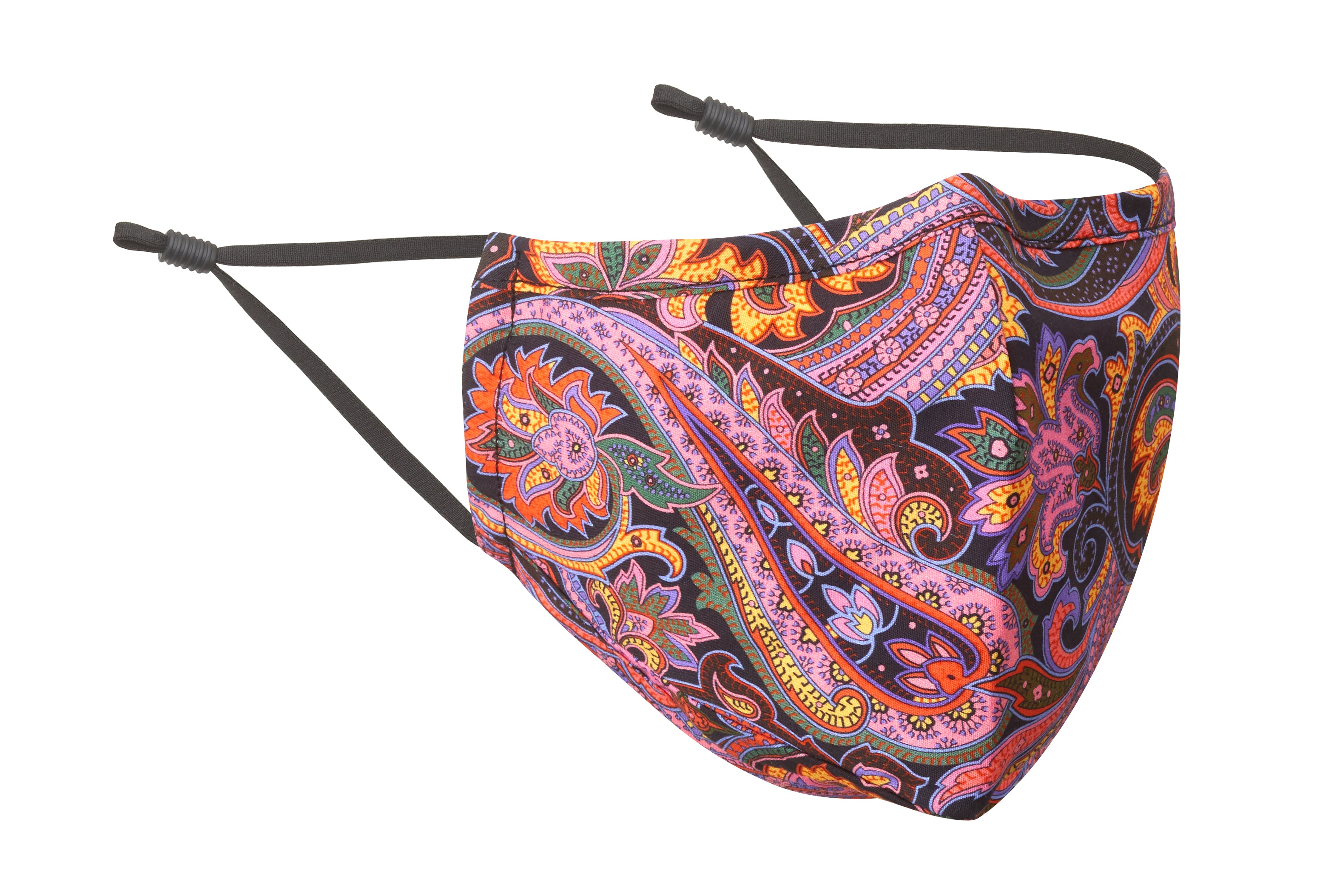 Paisley and floral icons in shades of pink, yellow, blue, orange and brown bring light and motion to this black cotton face mask.