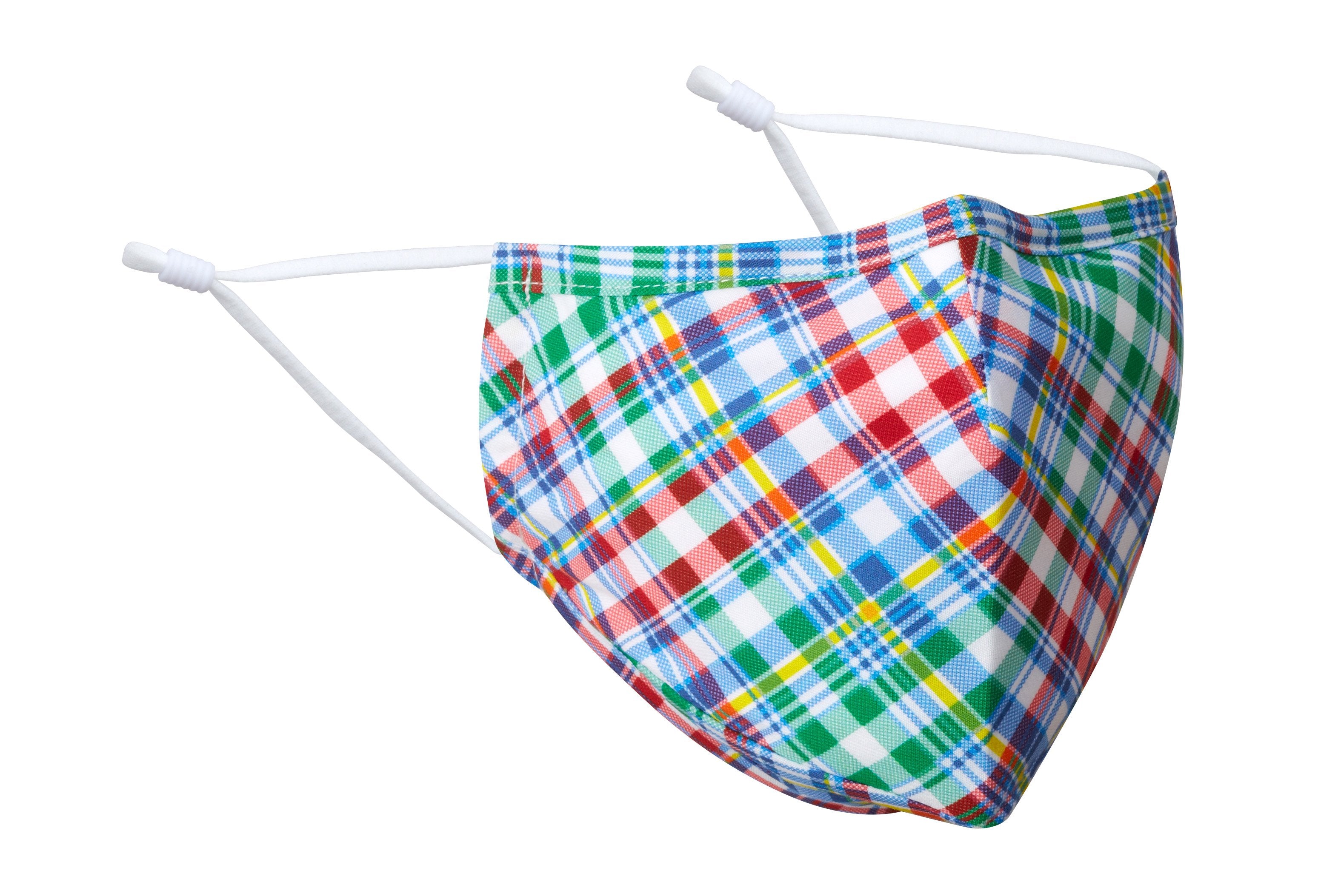 A classic madras plaid in a cheerful combination of red, blue, yellow and green on white cotton, this face mask is a cheerful must have.