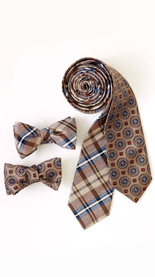 • Eaton: A sophisticated medallion design featuring dark brown and white circles surrounding silvery blue floral icons, all woven into a textured silk background in warm brown hues. A tie for the man who values timeless elegance.