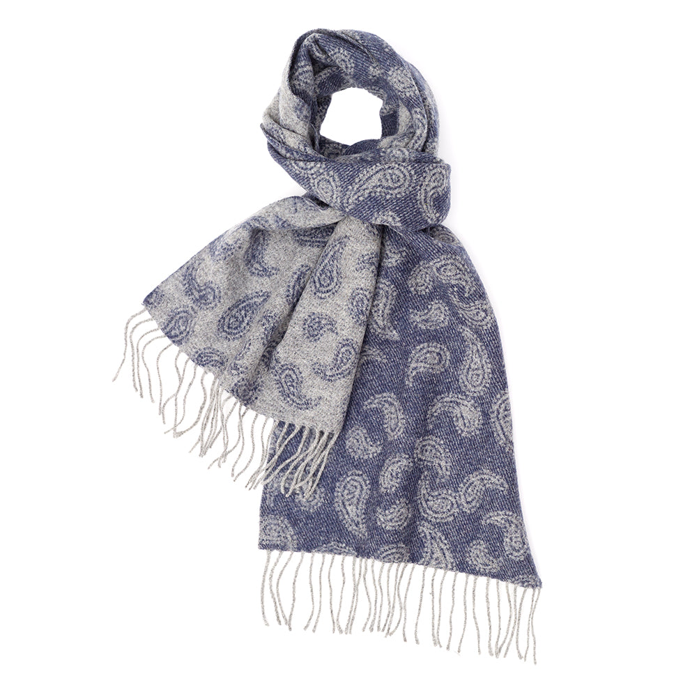 Big lazy grey paisleys are woven into a denim-blue background in this lovely 100% wool scarf.