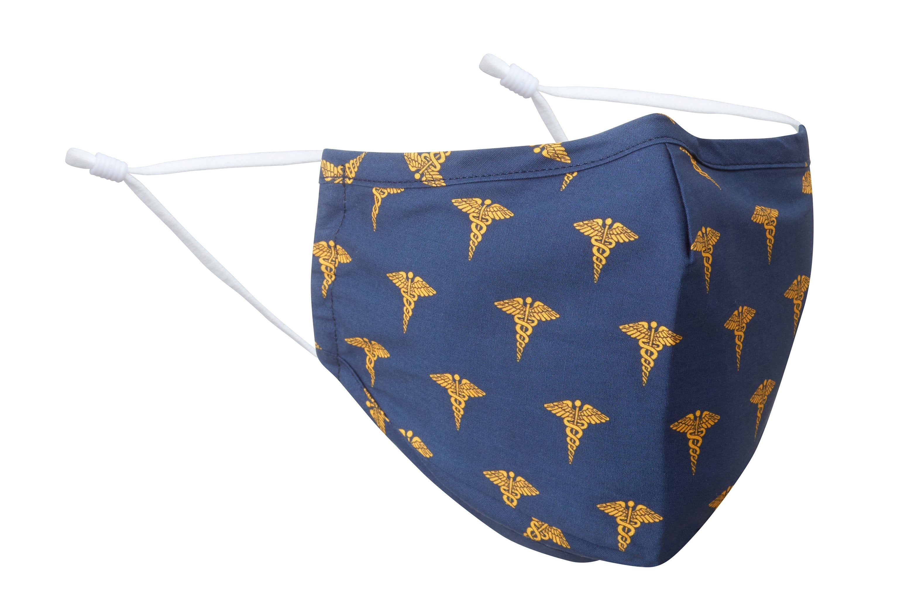 One golden Caduceus after another is featured n this handsome design on navy blue cotton.