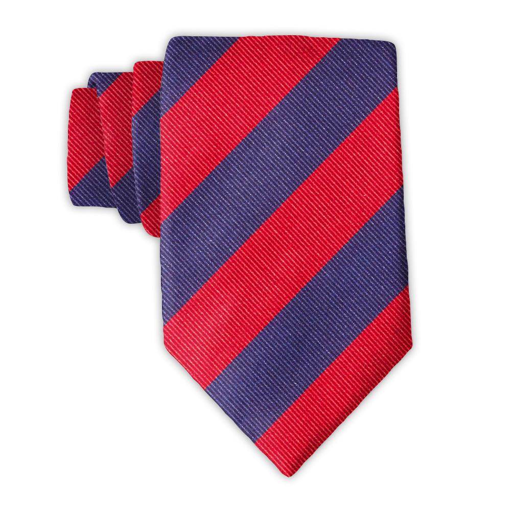 This handsome school tie is woven in ribbed silk and features bands of navy blue and dark red. A great choice regardless of where you actually spent your student days.