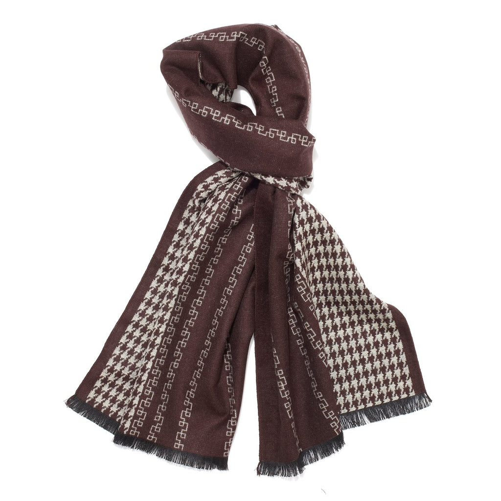 A delicious combination of houndstooth and border patterns in silver on burgundy are reversed on the back side of this handsome scarf.