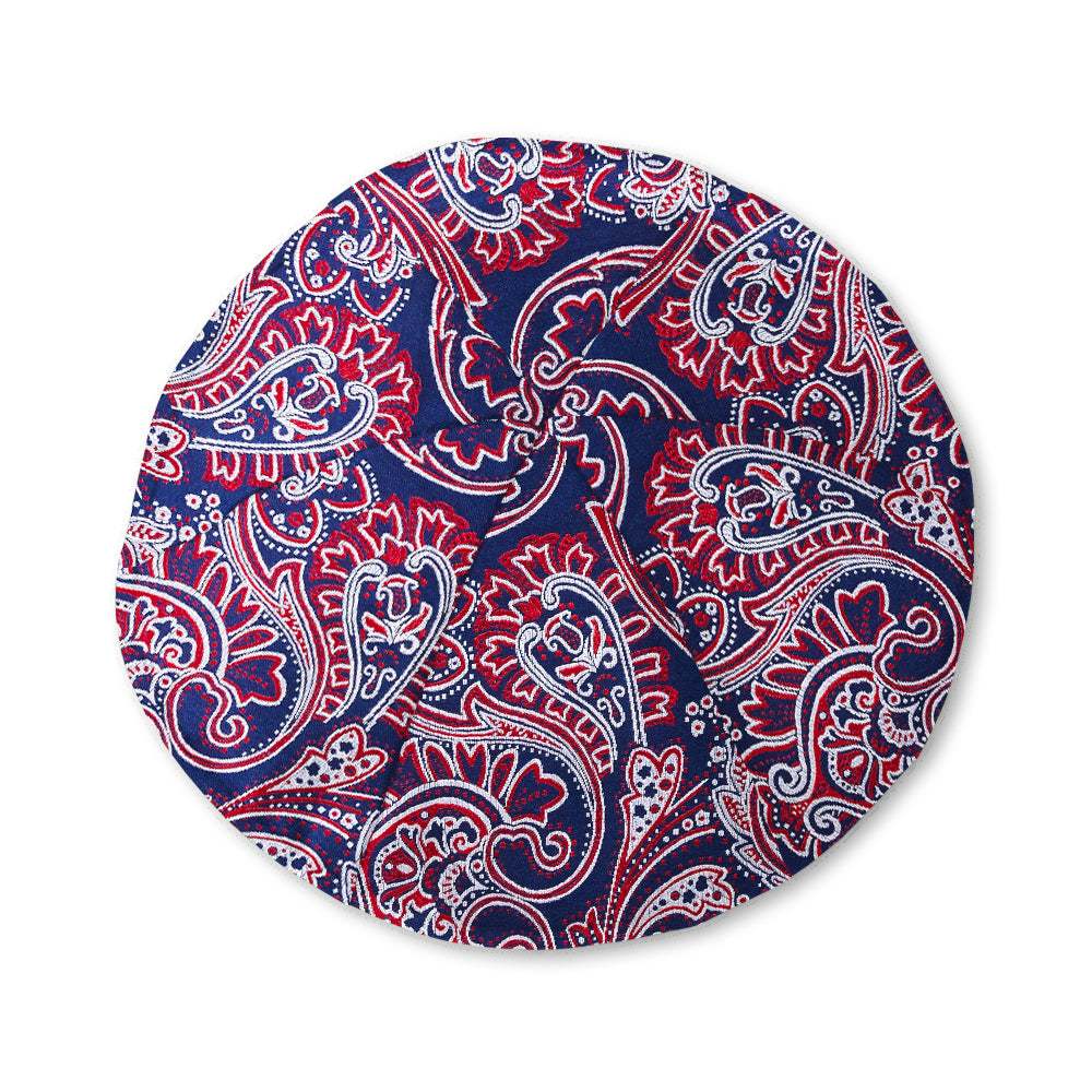 A simply beautiful navy blue woven silk with red and silver paisley patterns throughout.