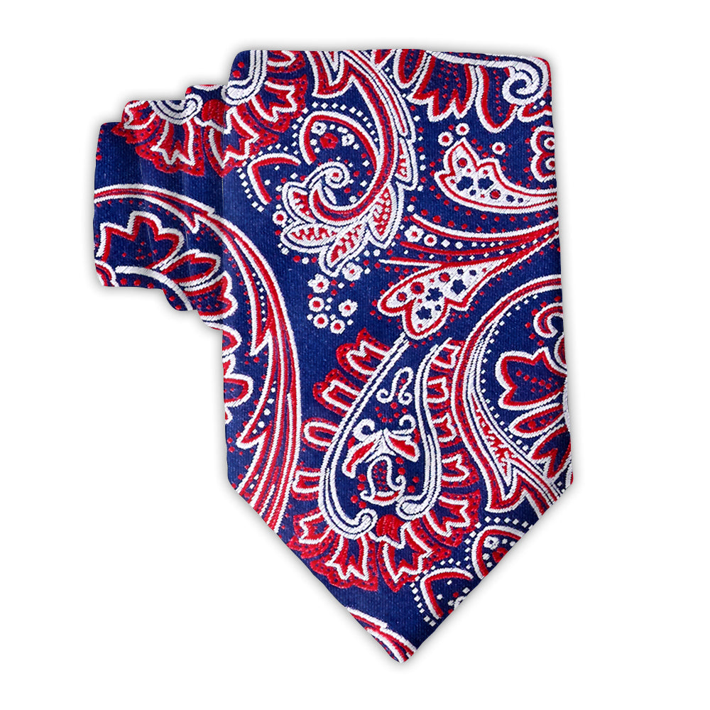 A simply beautiful navy blue woven silk with red and silver paisley patterns throughout.