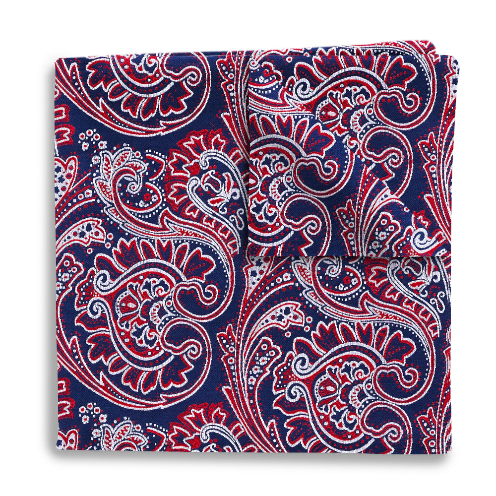 A simply beautiful navy blue woven silk with red and silver paisley patterns throughout.