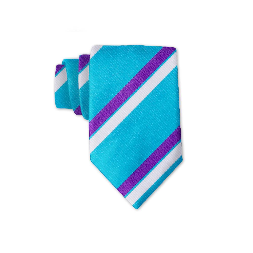 Check out this classic rep stripe pattern in a not-so-classic color combination featuring purple and white stripes between broad bands of aqua blue.Very cool.