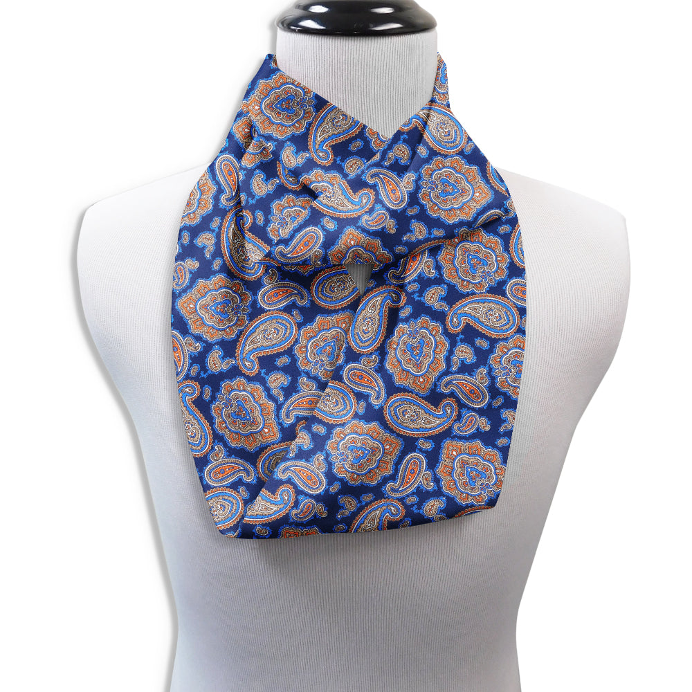 Lake blue Italian silk twill dances with paisleys and more - all in shades of blue and orange.