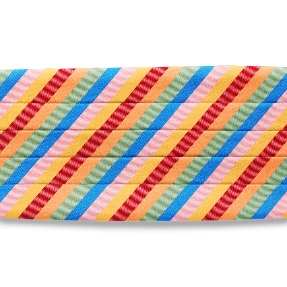 Beautiful woven silk stripes of pink, gold, red, orange, green and blue with alternating ribbed and smooth weaves. A unique choice.