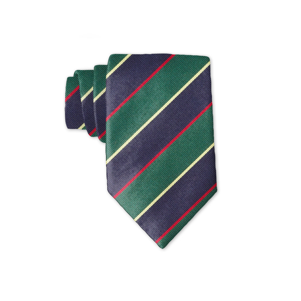You can't go wrong with this handsome woven silk Repp stripe with its broad navy blue and forest green stripes, highlighted by slim bands of red and yellow.