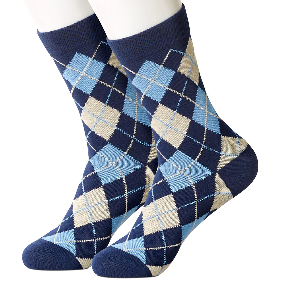 A classic argyle pattern featuring blue and ivory diamonds with navy tops, heels and toes.