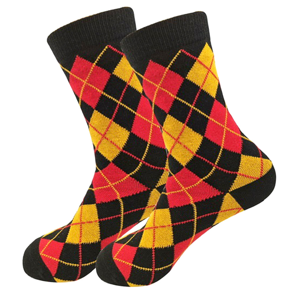 These socks feature a classic argyle pattern featuring orange and gold diamonds on dark brown.