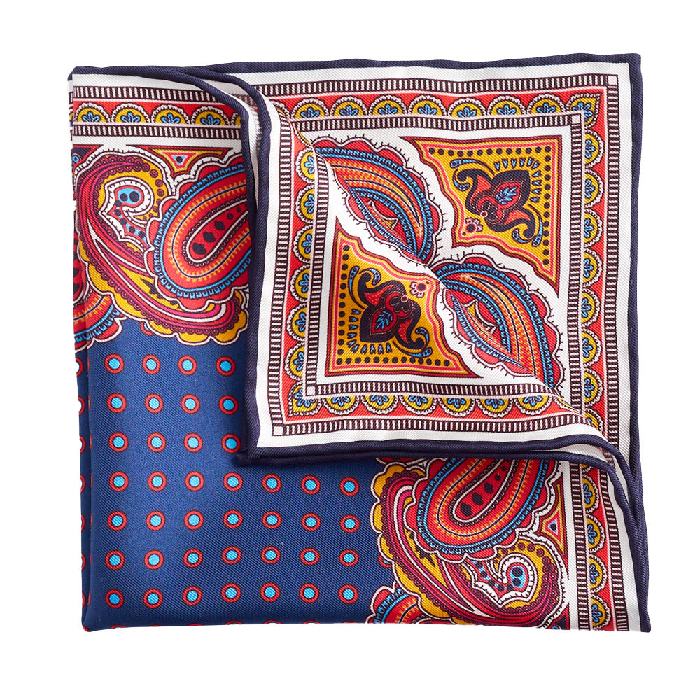 Add a splash of color to your outfit with this generously-sized 13 x 13 inch pocket square featuring red-bordered blue polka dots on navy blue silk twill surrounded by swirling paisleys of red, blue, gold and burgundy. A border of floral icons surrounds the lively design , and is finished with a hand-rolled navy blue hem.