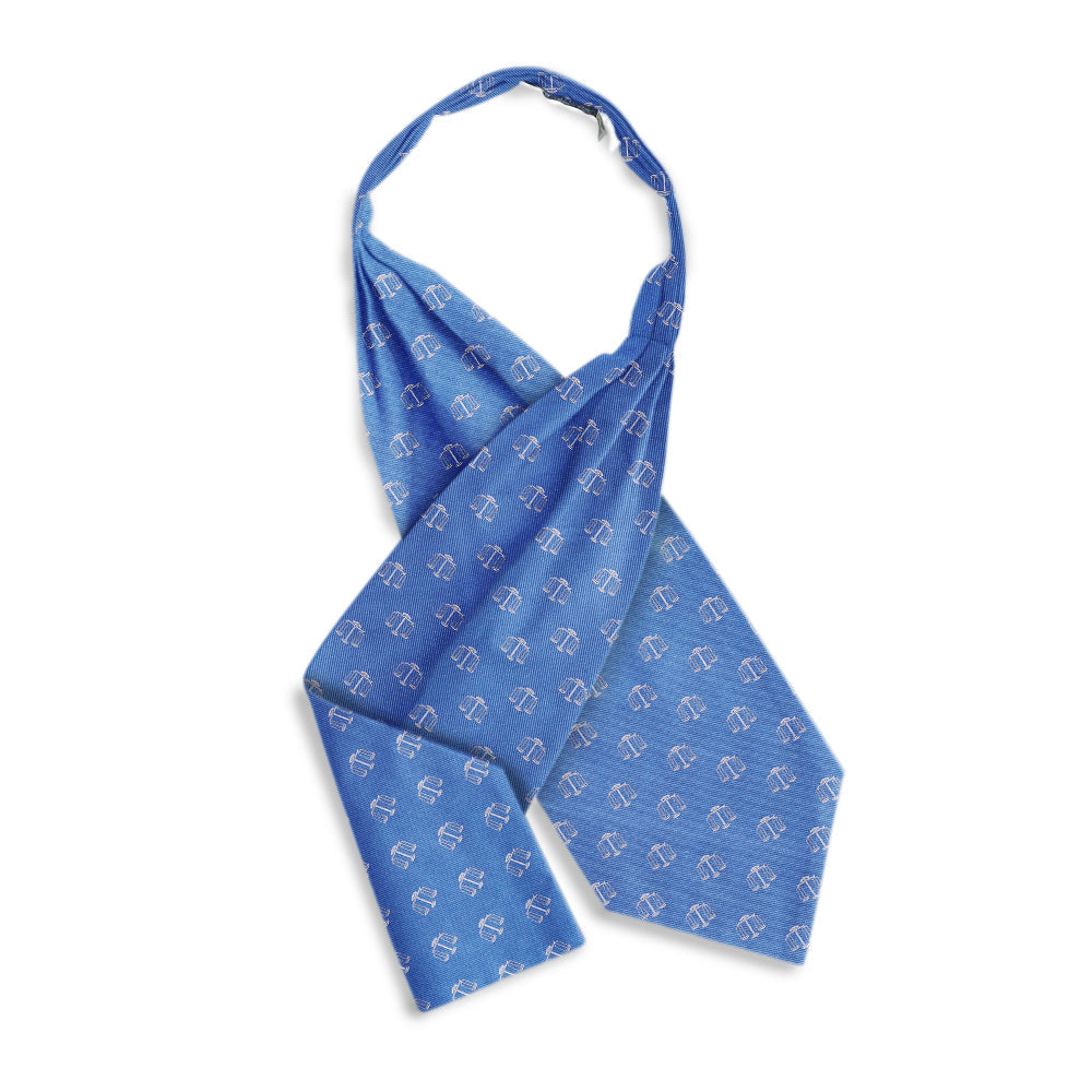 The Atticus Blue patterned free-fold cravat features three stitched center pleats that allow luxurious drape in front without fabric bulk at the nape of your neck. It is completely reversible and sized for a perfect fit. May require a stick-pin.
