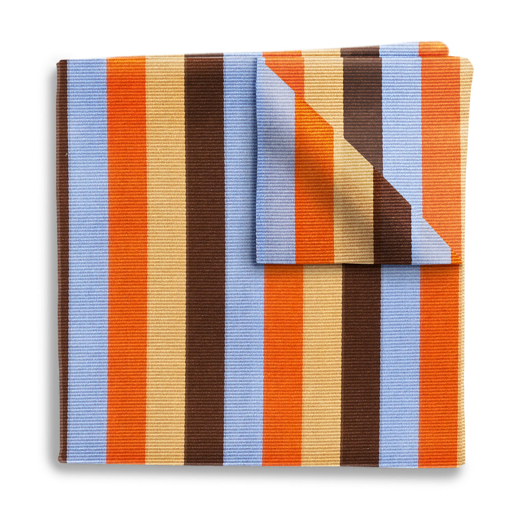 Beautifully ribbed woven silk in warm shades of tan, orange, blue and brown make this stripe a great choice - especially in autumn.