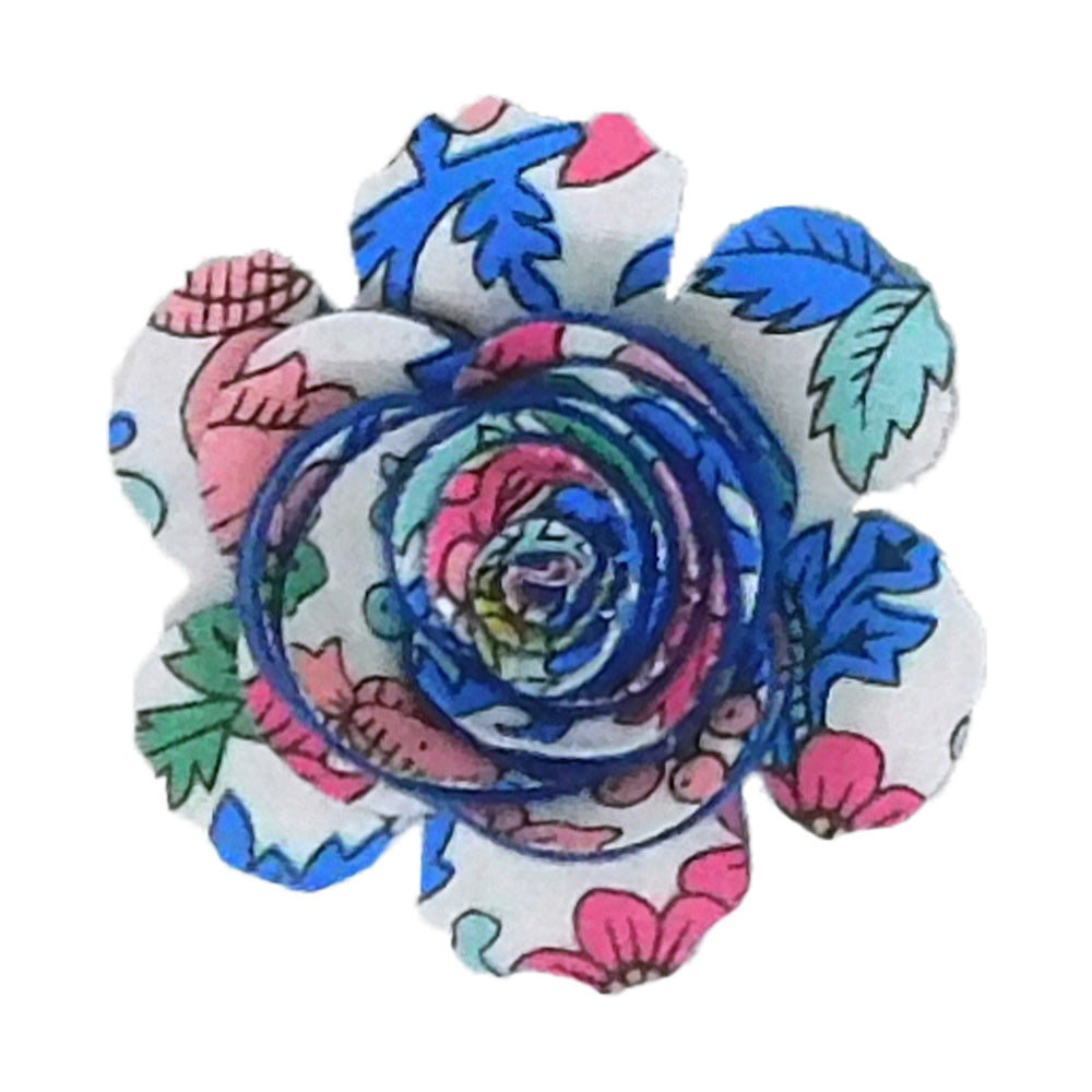 This cheerful boutonniere will not wilt or fade after you've tucked it into your lapel. A fun and refreshing design features pink flowers dancing among feathery foliage in shades of blue and green on white cotton. Backed with hand cut deep blue wool felt, it's finished with a pin to anchor it to your jacket.