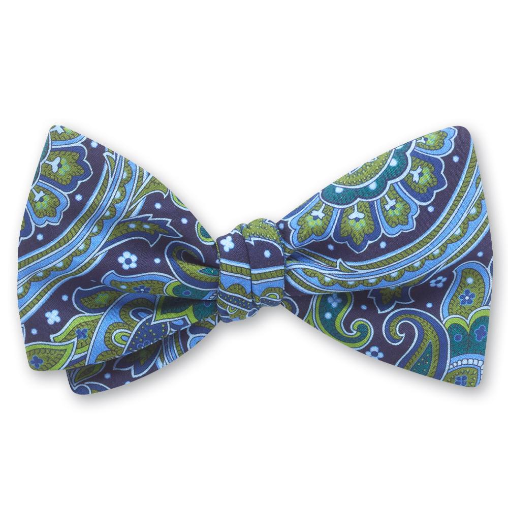 Big sprawling paisley and floral icons in shades of green and blue on navy blue printed silk will add some pizzazz to your day.