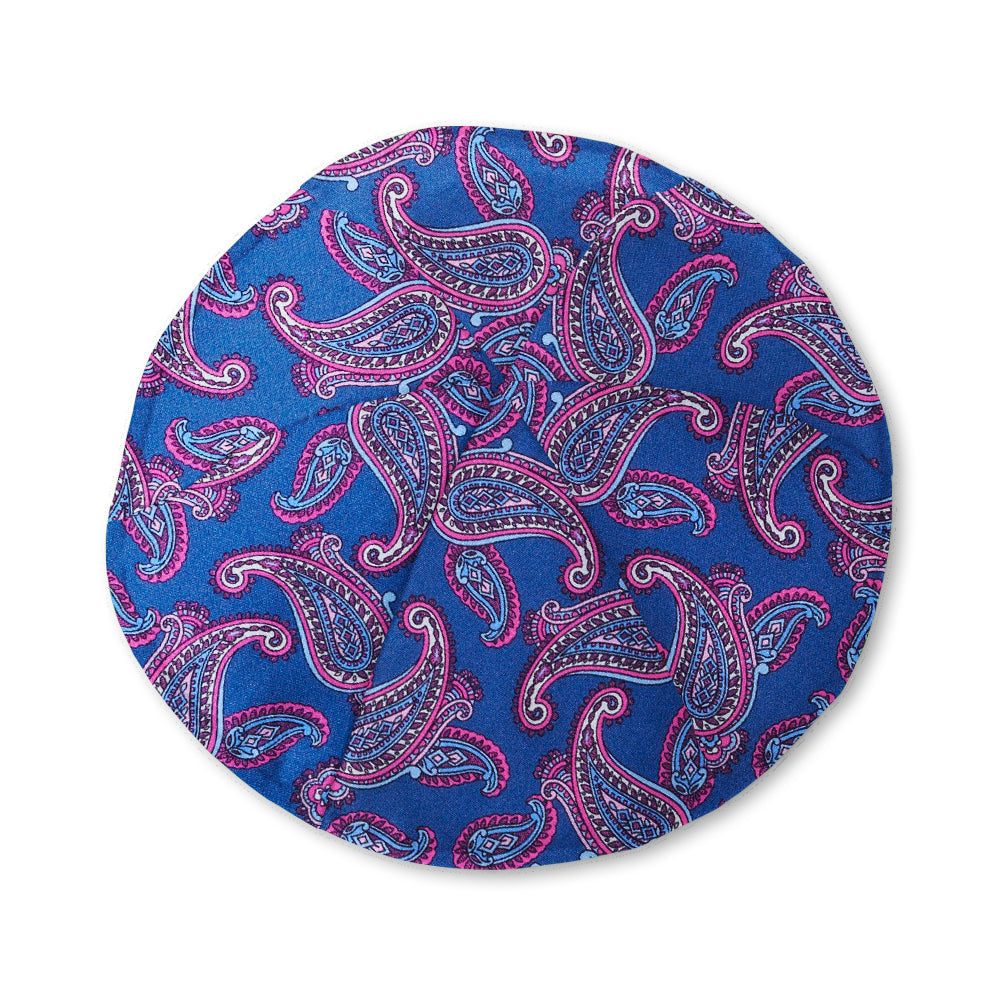 For fans of paisleys, here's an irresistible option featuring pink, white and light blue patterns on a delicious shade of lake blue Italian Silk twill.