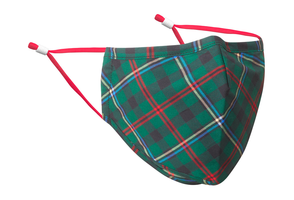 Dark green cotton crisscrossed with red, blue and white creates just about the perfect plaid face mask - for holidays and beyond.