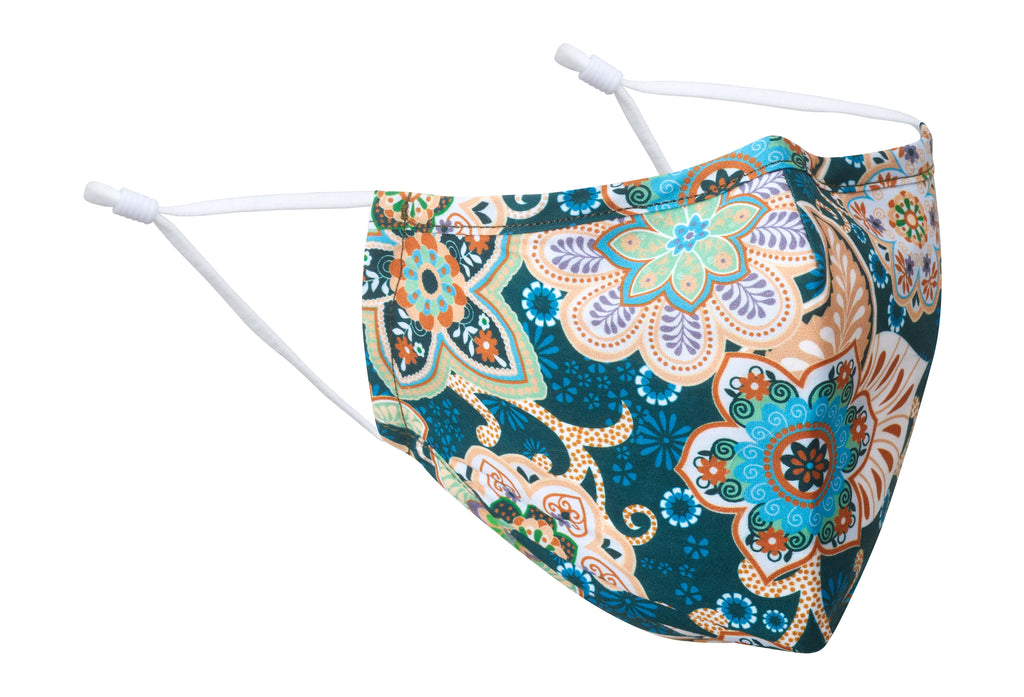 Be ready to catch an eye or two with this teal cotton mask with its fantasy floral design of big blossoms and foliage in in shades of green, blue and brown.
