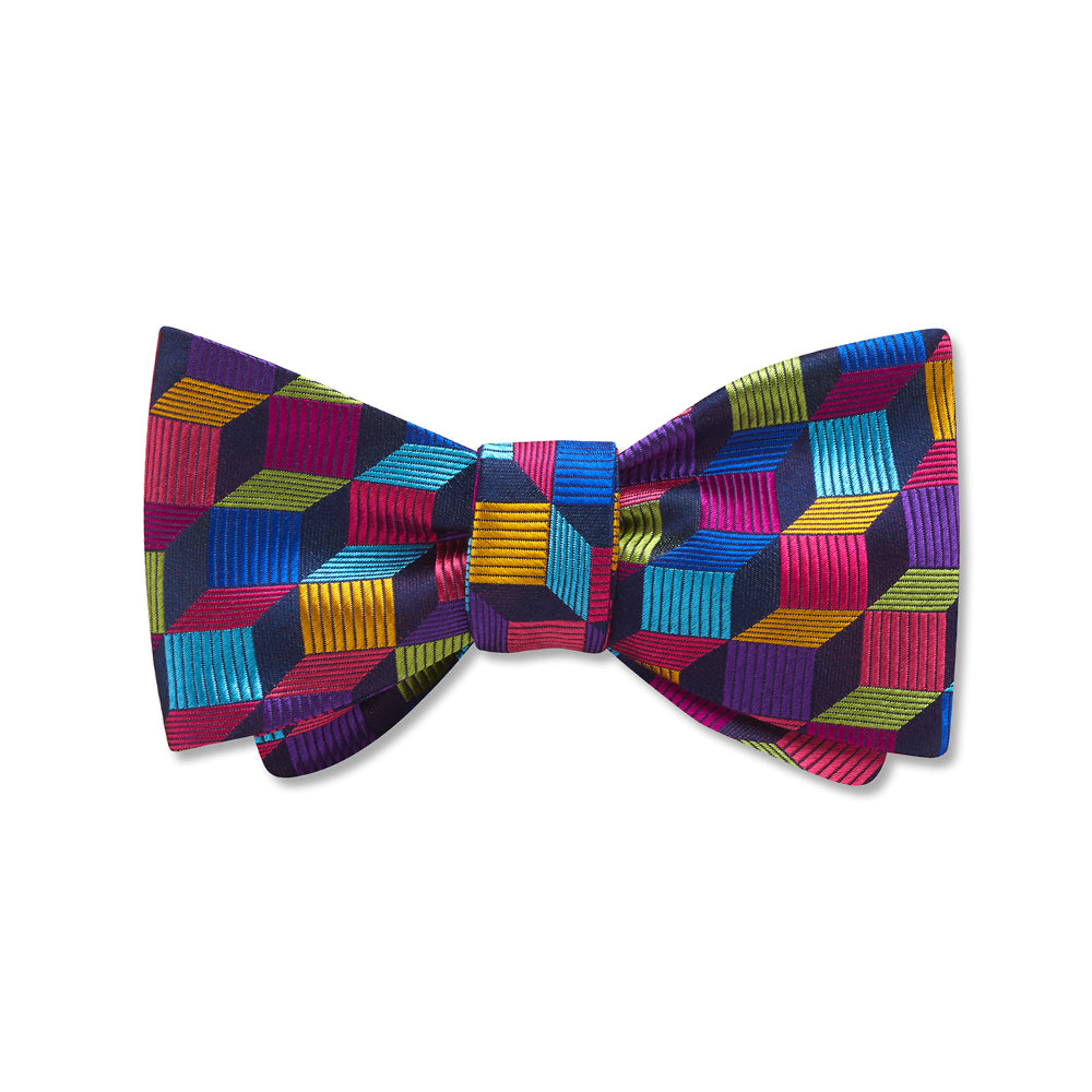 An optical illusion in woven silk, this wonderful design features multiple levels of cubes in shades of blue, gold, pink and green. Are they upside down or right side up?