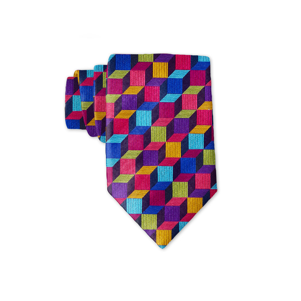 An optical illusion in woven silk, this wonderful design features multiple levels of cubes in shades of blue, gold, pink and green. Are they upside down or right side up?