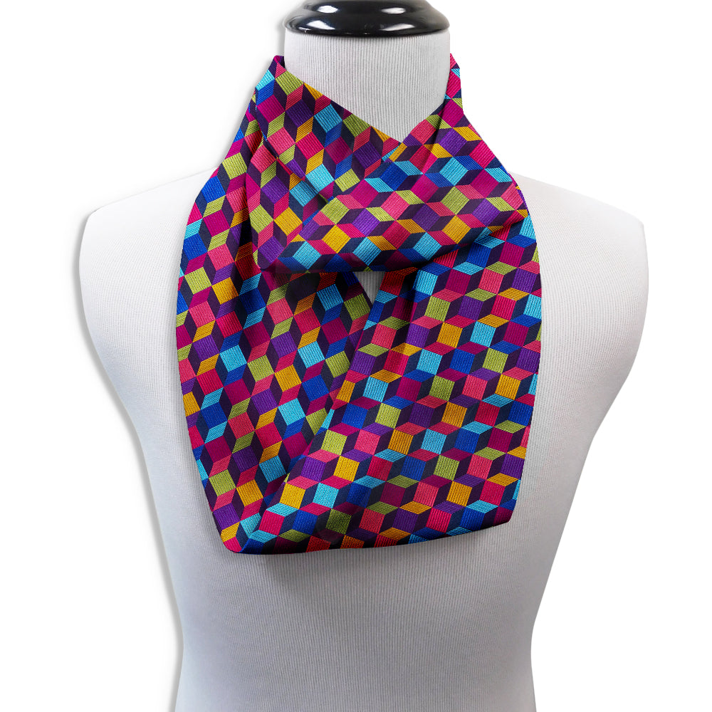 An optical illusion in woven silk, this wonderful design features multiple levels of cubes in shades of blue, gold, pink and green. Are they upside down or right side up?