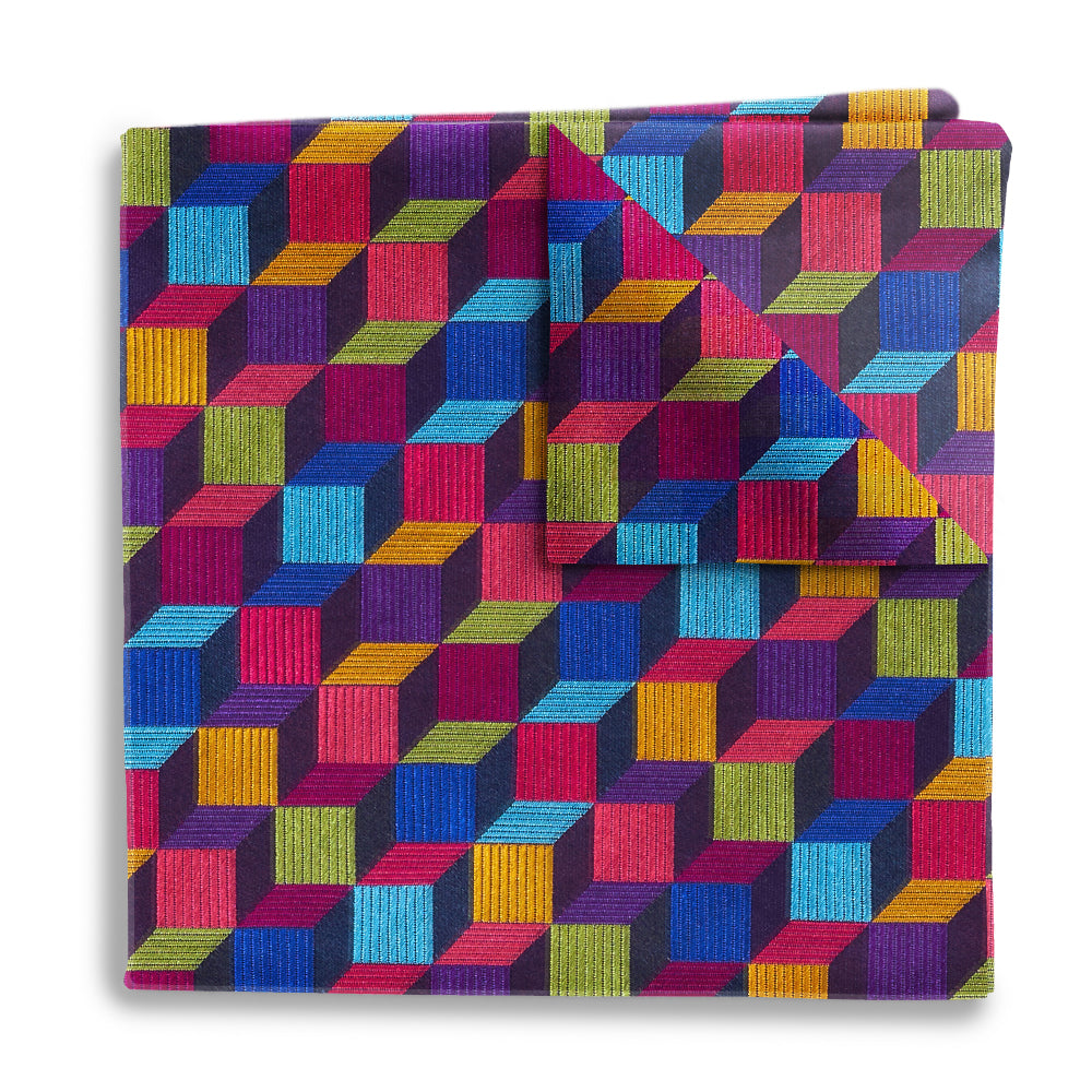 An optical illusion in woven silk, this wonderful design features multiple levels of cubes in shades of blue, gold, pink and green. Are they upside down or right side up?