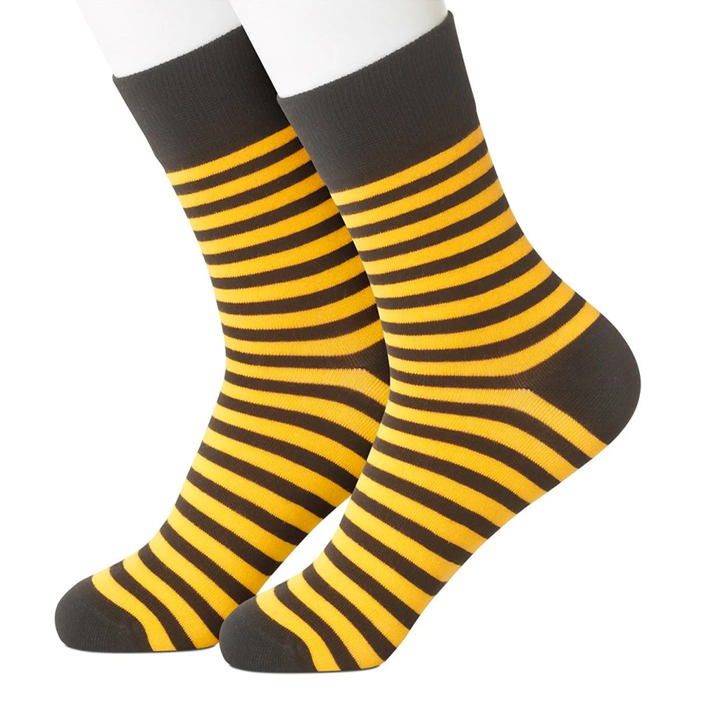 Catch an eye or two when you wear these bright yellow socks with navy blue stripes.
