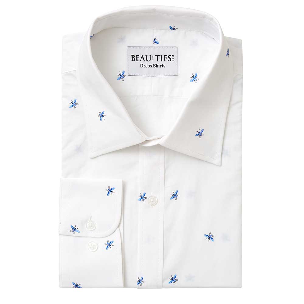 This smooth white 2-ply 80 count white cotton dress shirt hosts a happy hive of blue bees - all involved in an intricate dance that only they know. A nice change-up from your basic button-down.
