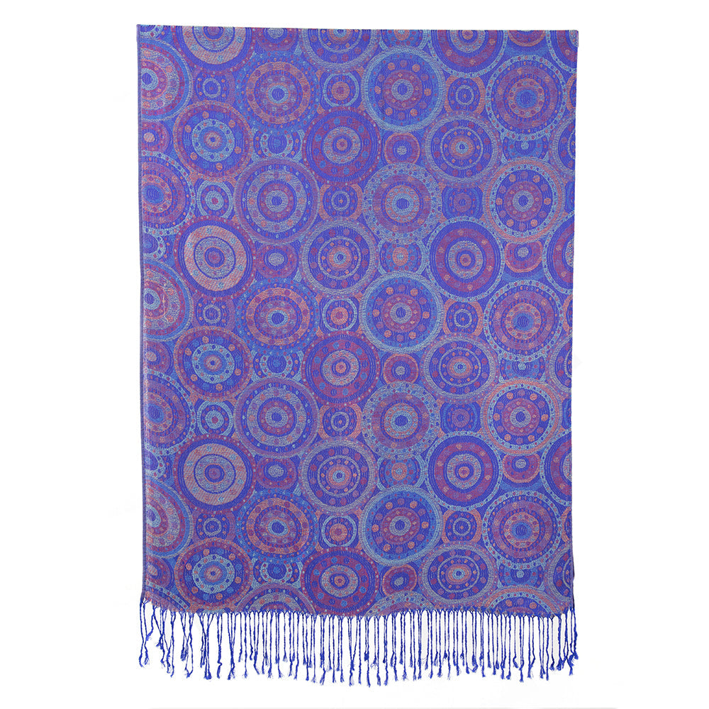 Big concentric circles in shades of blue, pink and orange are woven into this bright blue silky soft pashmina scarf.