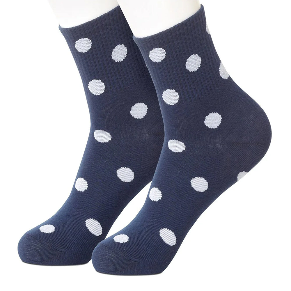 Slightly shorter than typical crew socks, these dark blue socks sport big white polka dots for a fun look.
