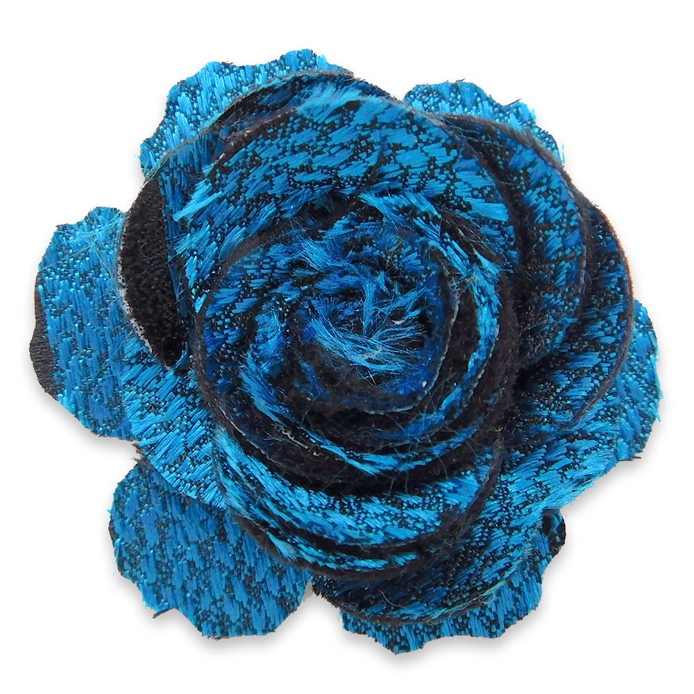This cheerful boutonniere will not wilt or fade after you've tucked it into your lapel. Featuring an abstract woven silk in a beautiful shade of bright blue backed with hand cut black wool felt, it's finished with a pin to anchor it to your jacket.