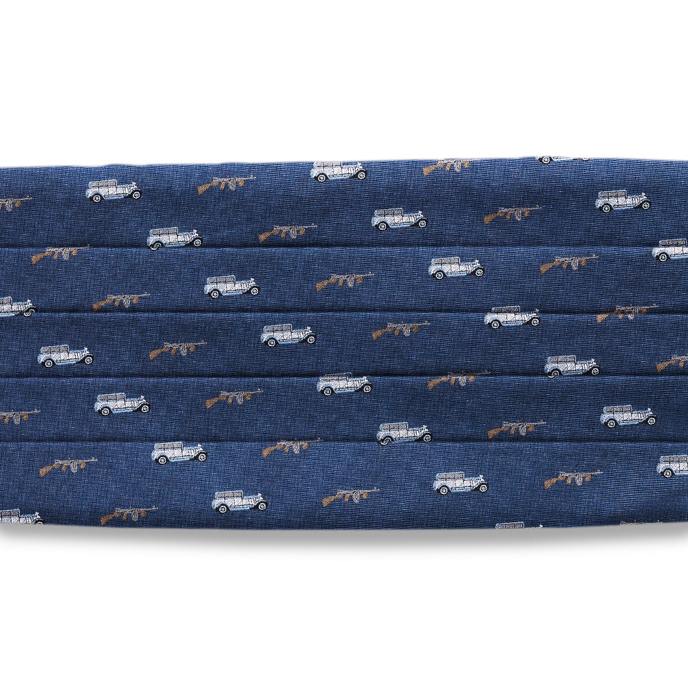 Classic getaway cars and tommy guns evoke a memory of times gone by woven in navy blue silk.