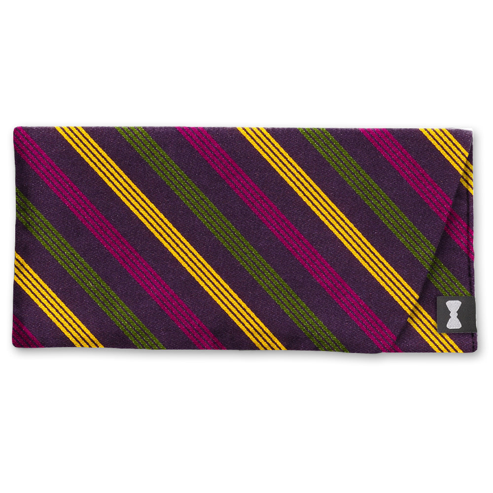 Repeating quartets of green, gold and purple stripes are woven in black silk in this engaging fabric. A great choice for Mardi Gras and beyond!