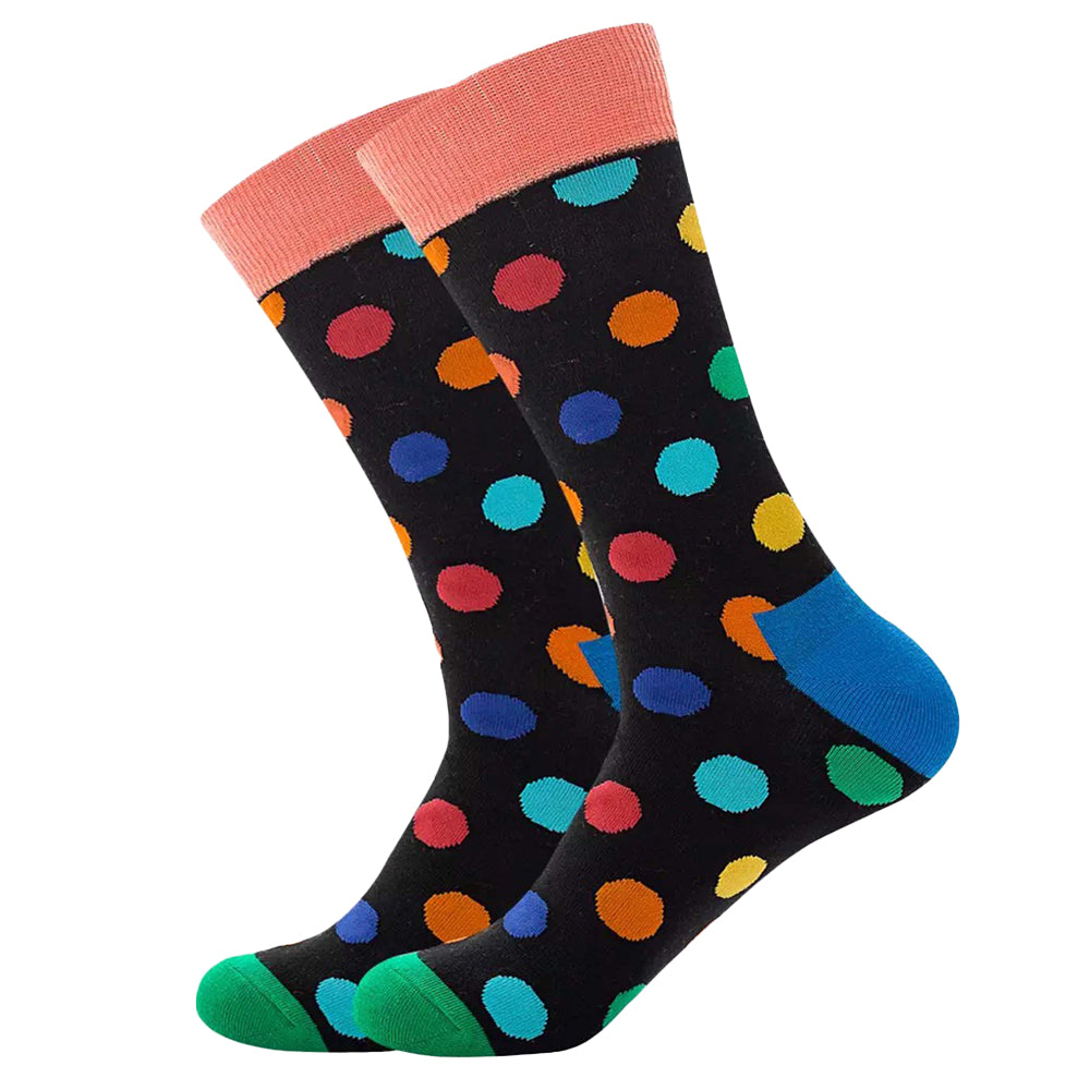 Not your father's black socks! These totally fun socks feature big polka dots of blue, pink, red, orange, green and gold bubbling up from green toes past blue heels to pink tops.