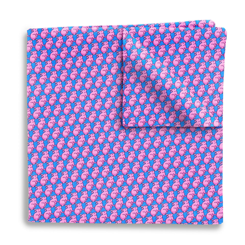 Deliciously pink bunnies hop in formation on a background of sky blue Italian silk twill.