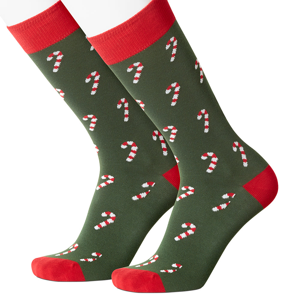 Rows of peppermint striped candy canes woven in a dark green background with red heels and toes. A totally fun holiday socks choice.