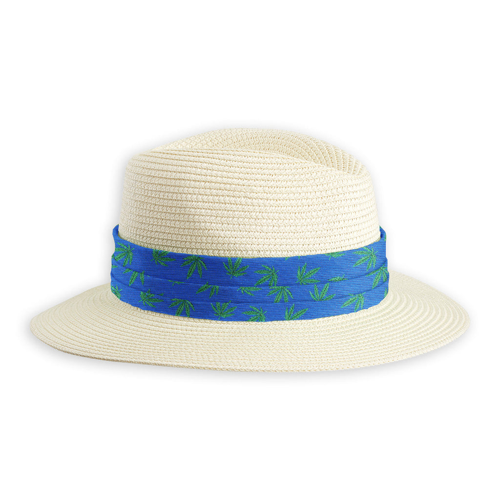 Bright green cannabis leaves woven in lightly ribbed bright blue silk are sure to start (or maybe stop?) a conversation!