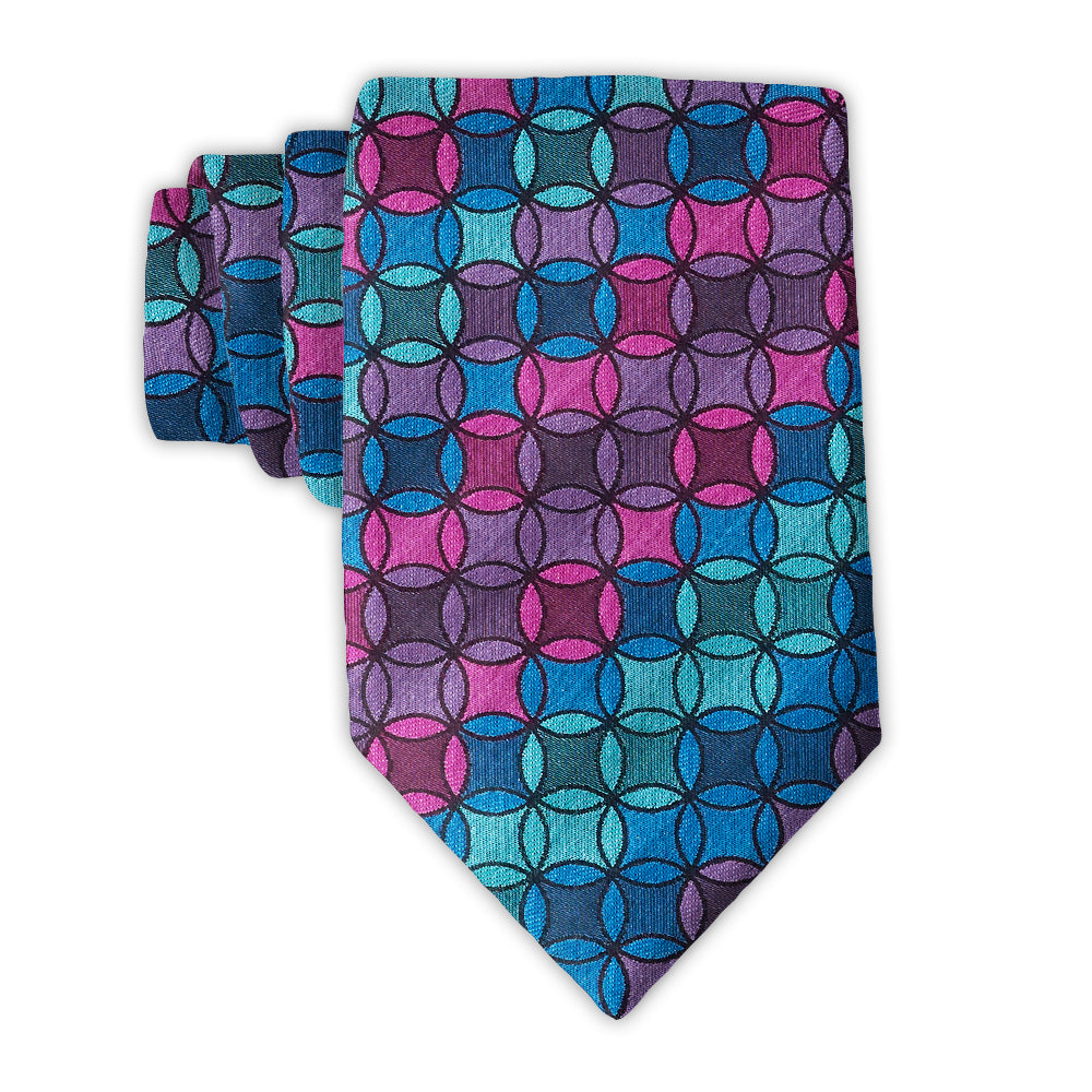 A series of overlapping circles - each bordered in black - woven in bands of purple, blue, aqua and pink silk - are at the heart of this intricate and eye-catching geometric design.