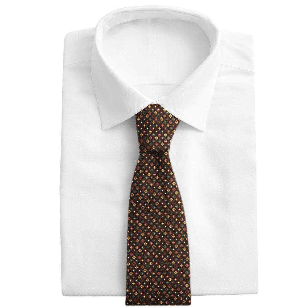 Petite blossoms in a variety of colors, are aligned neatly on black silk twill in this understated, and oh-so-appealing, floral design.