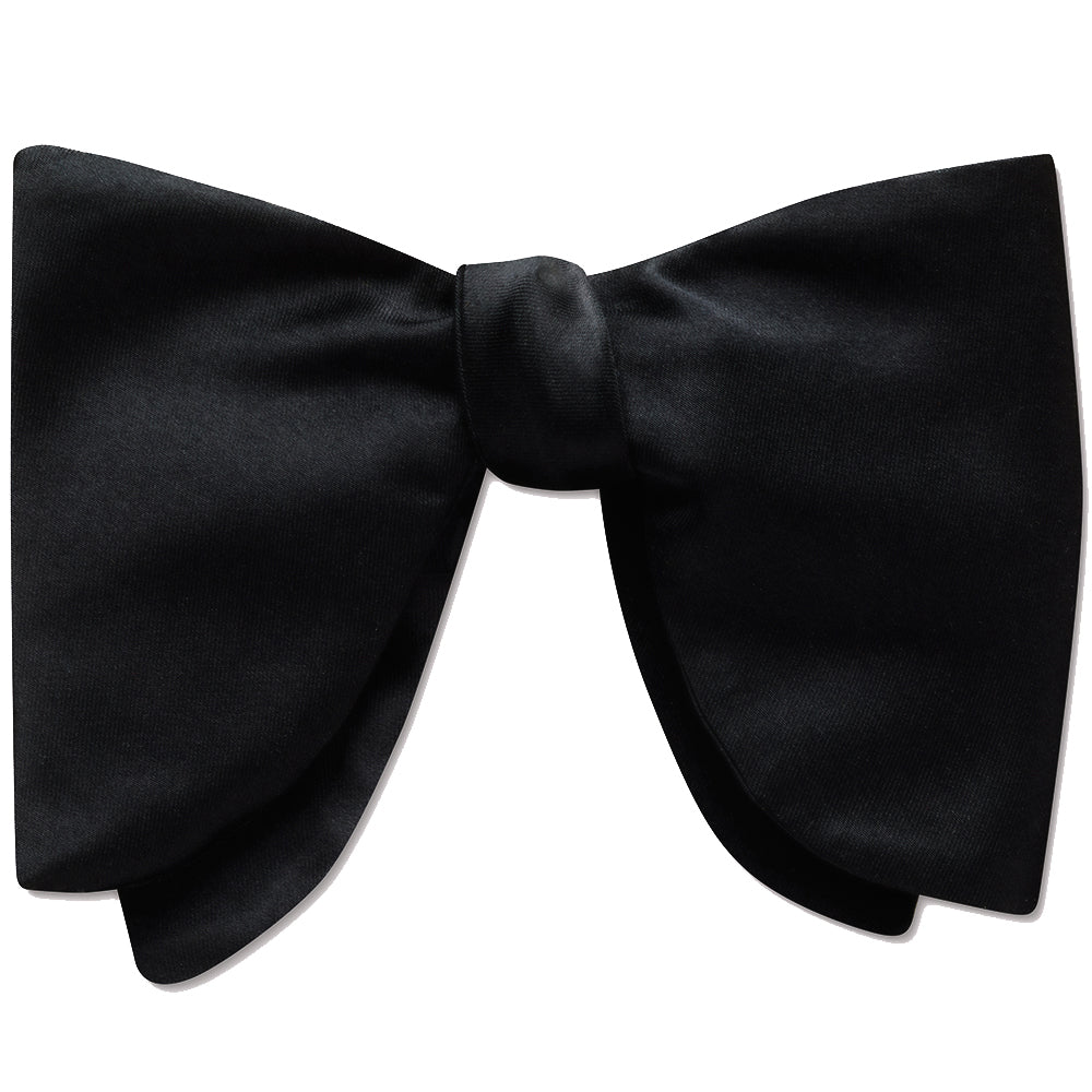 Ready for a practically perfect party tie? This is it! Created in our shiny, classic black silk charmeuse, this wonderful teardrop butterfly bow measures 4" tall and 6" wide. A huge trend now at black tie affairs. Try our matching cummerbund or suspenders.