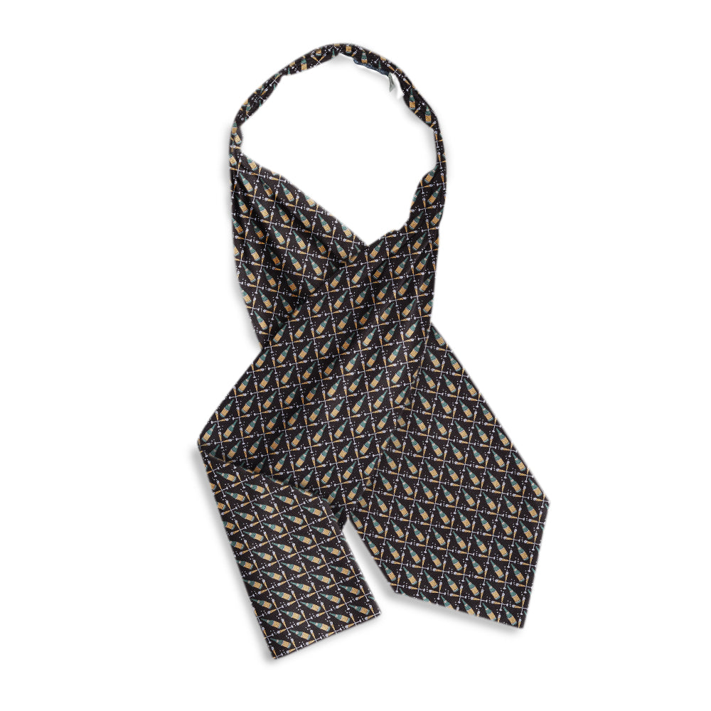 Ring in the New Year - or any special occasion, for that matter - wearing this beautiful black woven silk with its bottles of bubbly bordered with crisscrossing flutes, already filled in anticipation of raising a glass to all good things. Cheers!