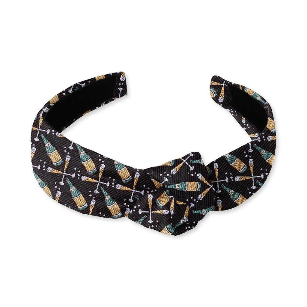 Ring in the New Year - or any special occasion, for that matter - wearing this beautiful black woven silk with its bottles of bubbly bordered with crisscrossing flutes, already filled in anticipation of raising a glass to all good things. Cheers!