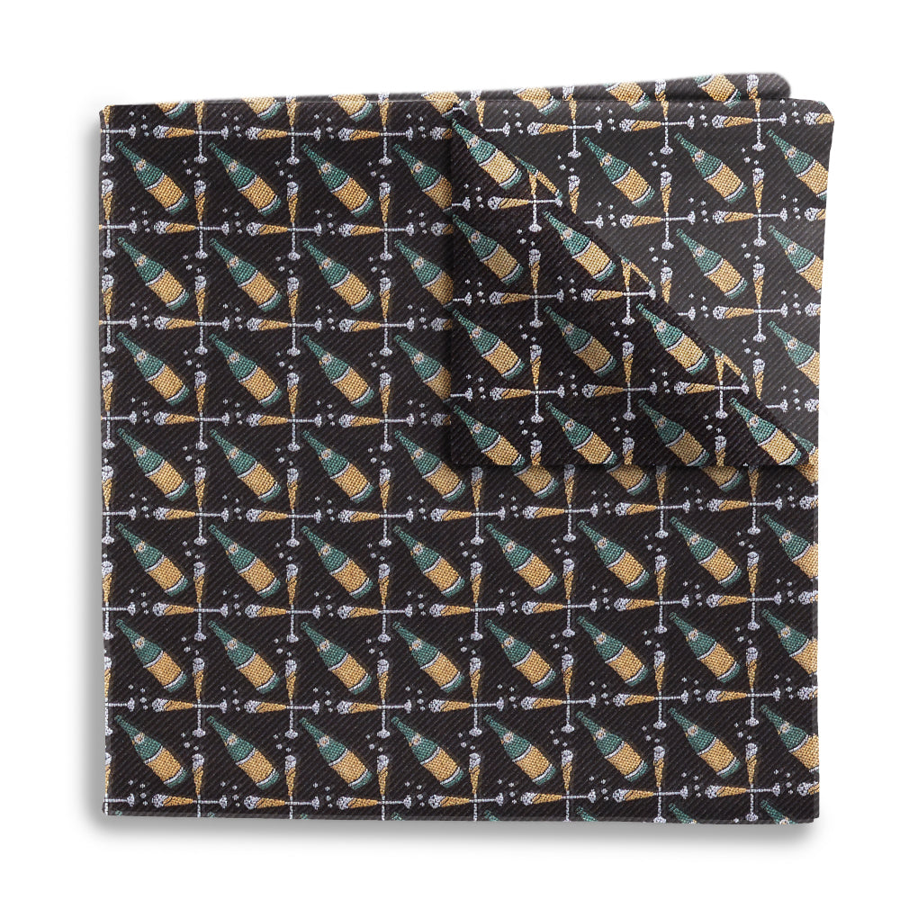 Ring in the New Year - or any special occasion, for that matter - wearing this beautiful black woven silk with its bottles of bubbly bordered with crisscrossing flutes, already filled in anticipation of raising a glass to all good things. Cheers!