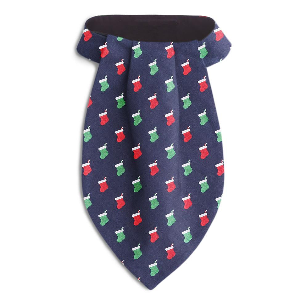 Navy blue woven silk hosts a repeating pattern of red and green holiday stockings - each one trimmed with white and hanging on a silver peg - just waiting for the jolly old elf's visitation.