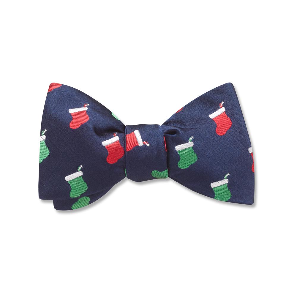 Navy blue woven silk hosts a repeating pattern of red and green holiday stockings - each one trimmed with white and hanging on a silver peg - just waiting for the jolly old elf's visitation.