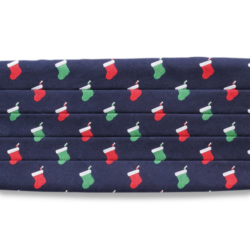 Navy blue woven silk hosts a repeating pattern of red and green holiday stockings - each one trimmed with white and hanging on a silver peg - just waiting for the jolly old elf's visitation.